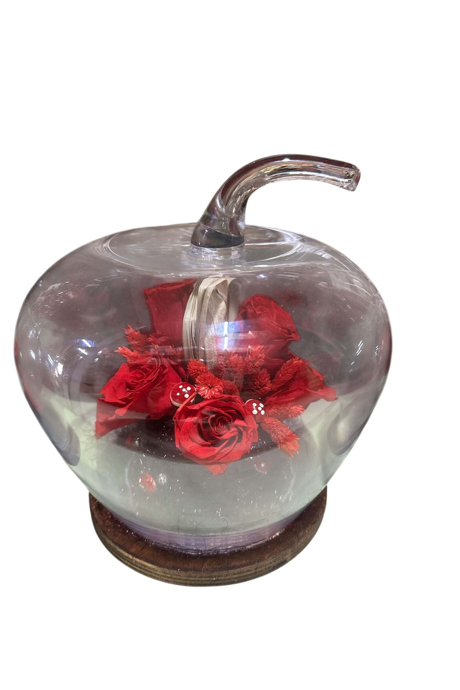 TERS ELMA CAM İÇERİSİNE KURU OTLAR VE OBJELER İLE TANZİM EDİLMİŞTİR.