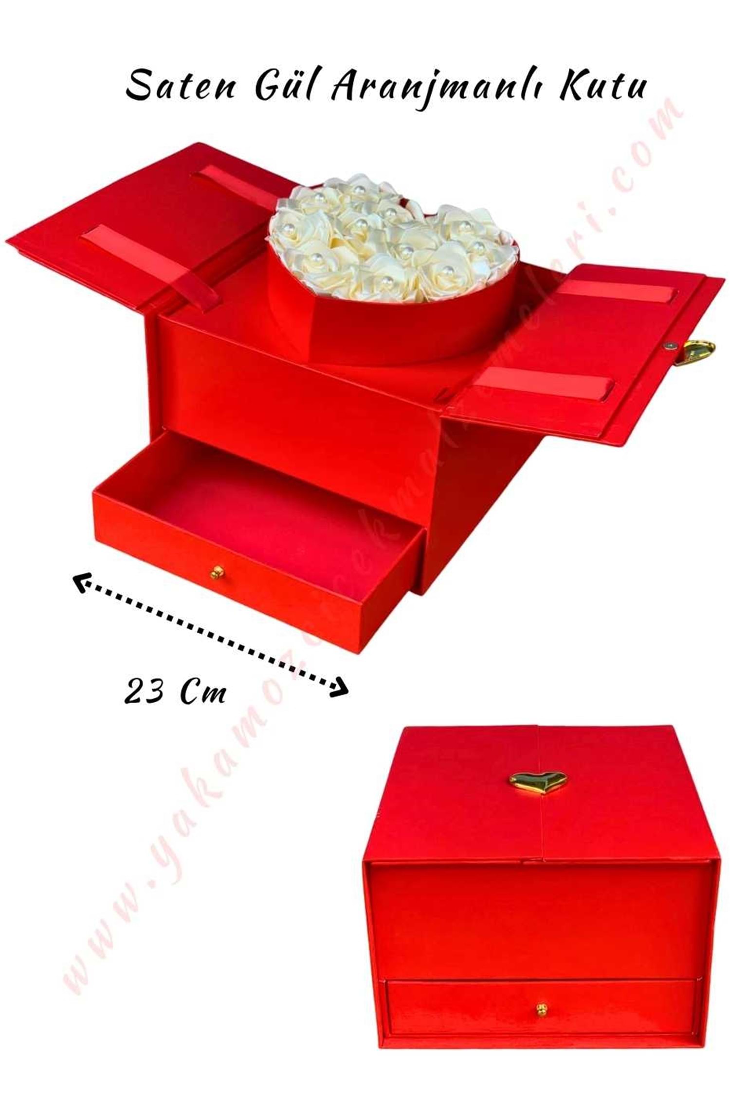 Saten Gül Aranjmanlı Asansörlü Çekmeceli Çiçek Çikolata Hediye Kutusu.