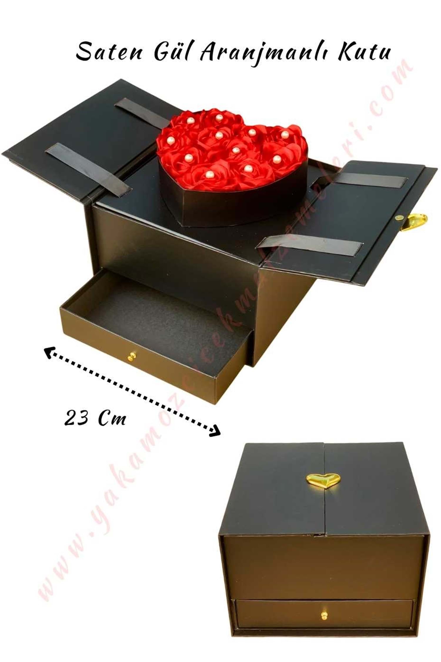 Saten Gül Aranjmanlı Asansörlü Çekmeceli Çiçek Çikolata Hediye Kutusu KUTU YK-59 - Siyah