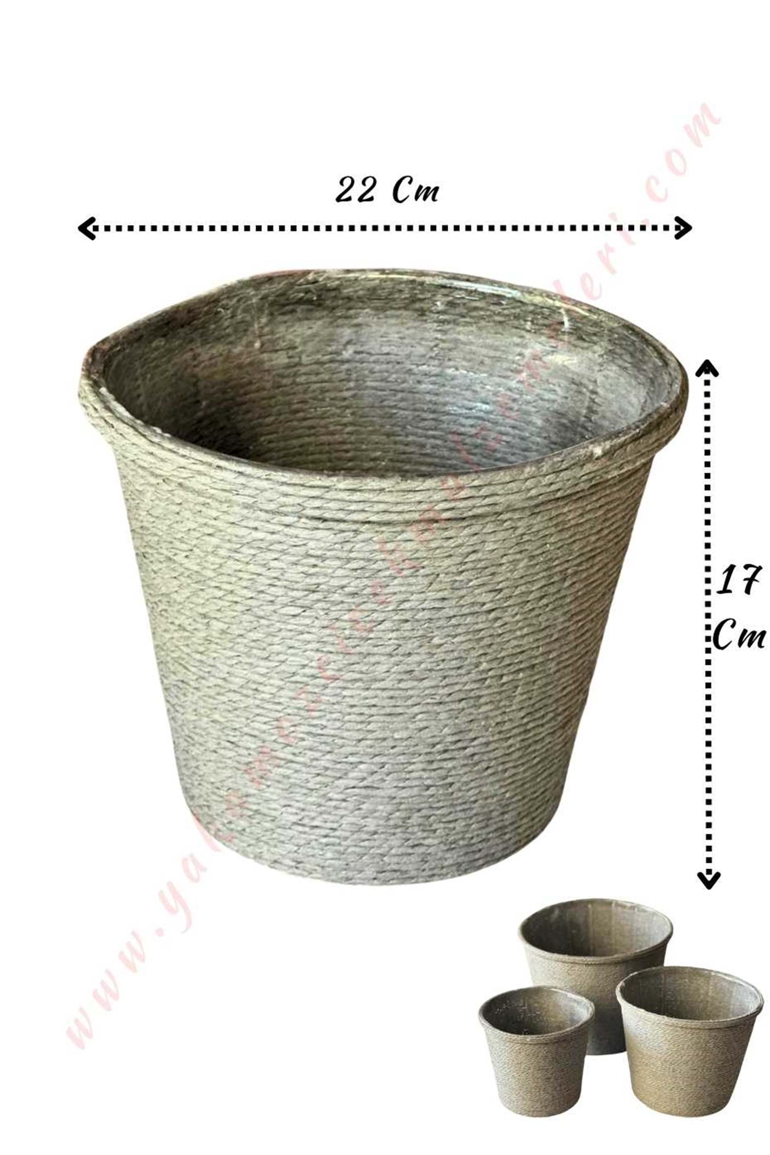 Hasır İp Sarılı Su Geçirmez Plastik Büyük Saksı Çap 22 Cm Boy 17 Cm YK-299 - Gri