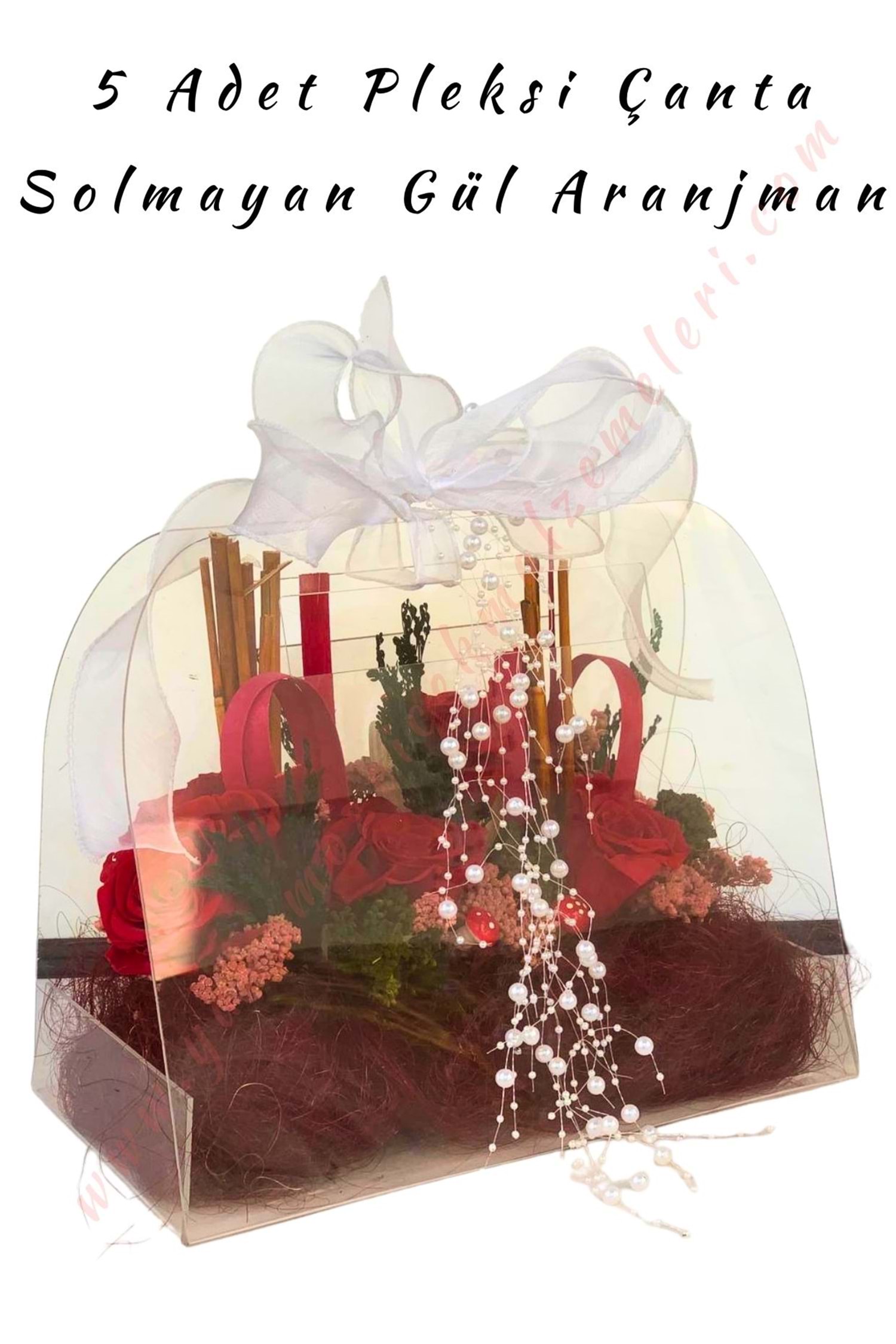 5 Adet Solmayan Gül Aranjmanlı Pleksi Çanta 30*25*17 Cm