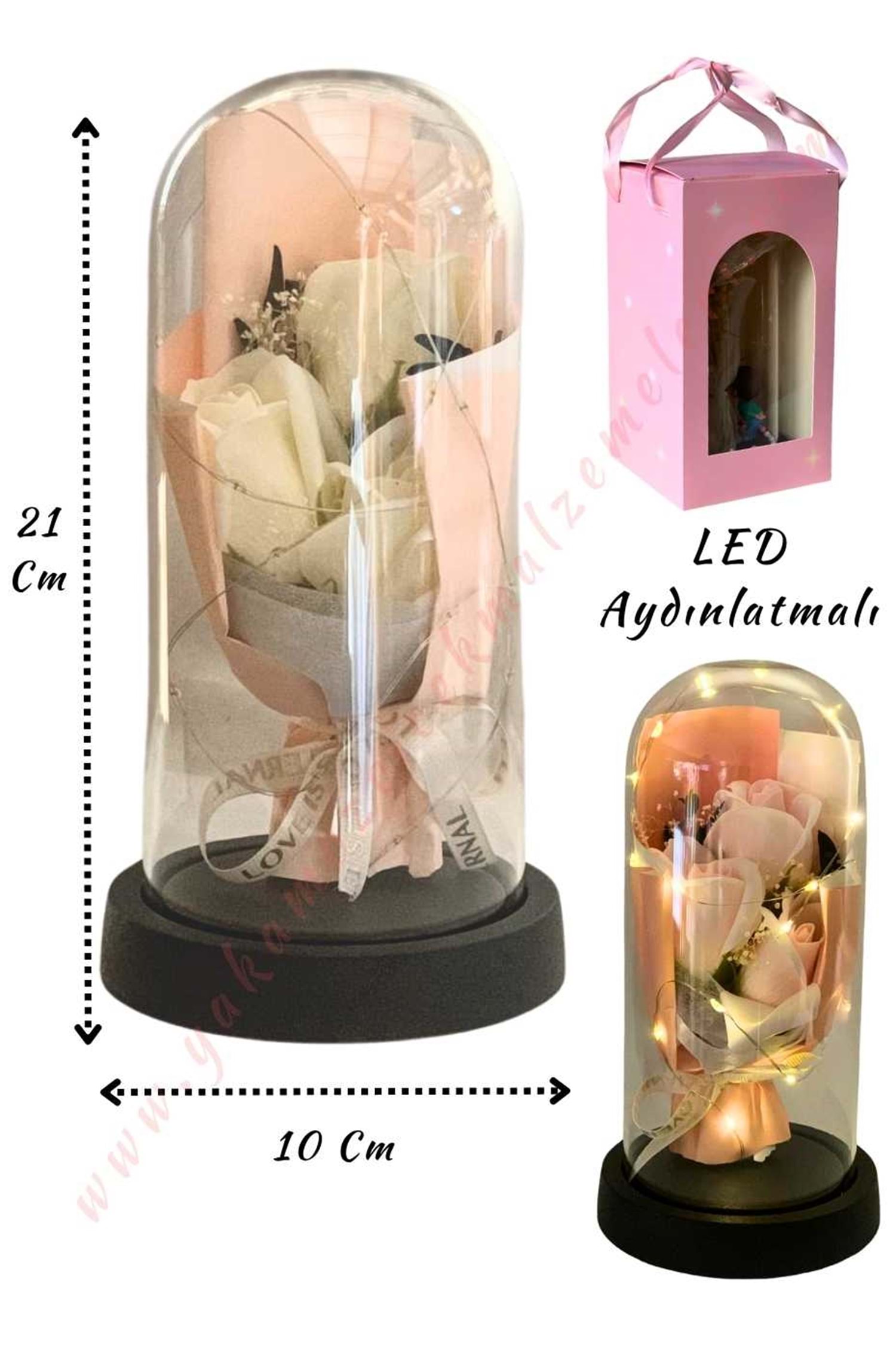 Gül Süslemeli Işıklı Fanus Hazır Tanzim Çap 10 Cm Yükseklik 21 Cm YK-434