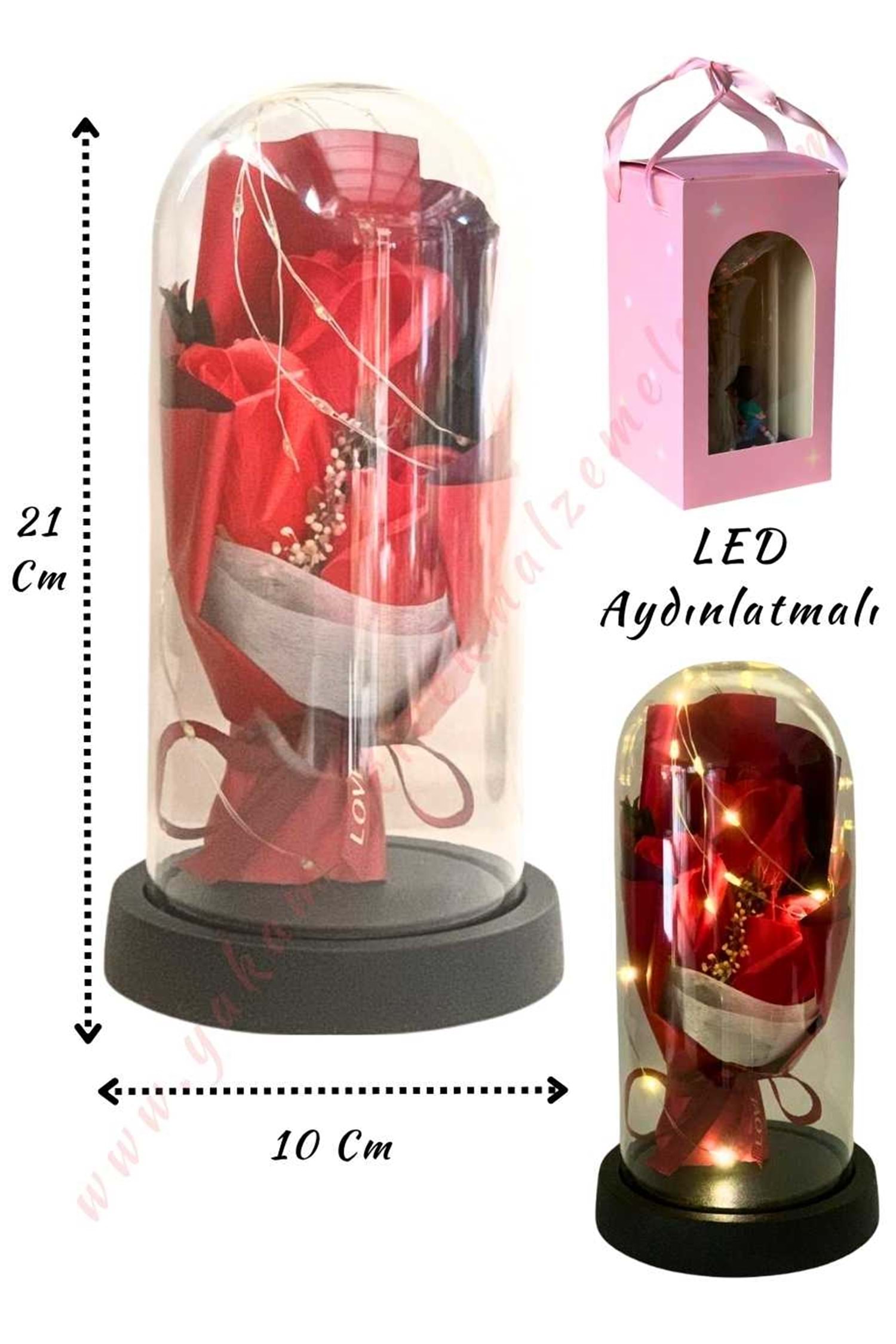 Gül Süslemeli Işıklı Fanus Hazır Tanzim Çap 10 Cm Yükseklik 21 Cm YK-434 - Kırmızı